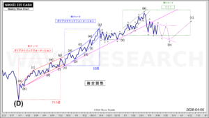 | 中期(数週規模) | 昨年からの複合調整完了し新規パターンスタートするかどうかの場面。 |