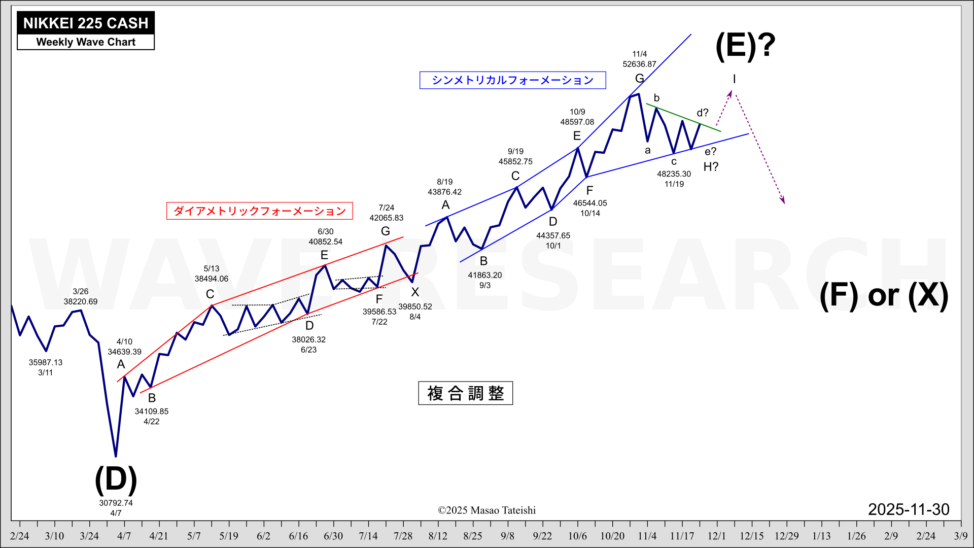 日経平均株価波動分析 2025-12-07 2025 12/07 チャート分析 2025-12-07 短期(数日規模)目先はトライアングルからの小さな上放れか。中期(数週規模)シンメトリカルフォーメーションの最後の波に入ったか。長期(数ケ月規模)高値・安値の切り上がりが継続する上昇トレンドだが調整局面近付く。 12月第1週の日経平均は安値・49215から高値・51028までの動き。週足チャートではわずかに上に抜けたようすが窺えます。前回述べた二つの解釈のうち、収縮トライアングルが完了したパターンのように見えます。 前回掲載のチャート チャート分析 日経平均株価 短期波動 日経平均株価サイクル分析 2025-12-07 関連記事 日経平均株価サイクル分析 2025-12-07 2025-12-07 日経平均株価波動分析 2025-11-30 2025-11-30 日経平均株価サイクル分析 2025-11-30 2025-11-30 日経平均株価波動分析 2025-11-24 2025-11-24 日経平均株価サイクル分析 2025-11-23 2025-11-23 日経平均株価波動分析 2025-11-16 2025-11-16 日経平均株価サイクル分析 2025-11-15 2025-11-15 日経平均株価波動分析 2025-11-09 2025-11-09