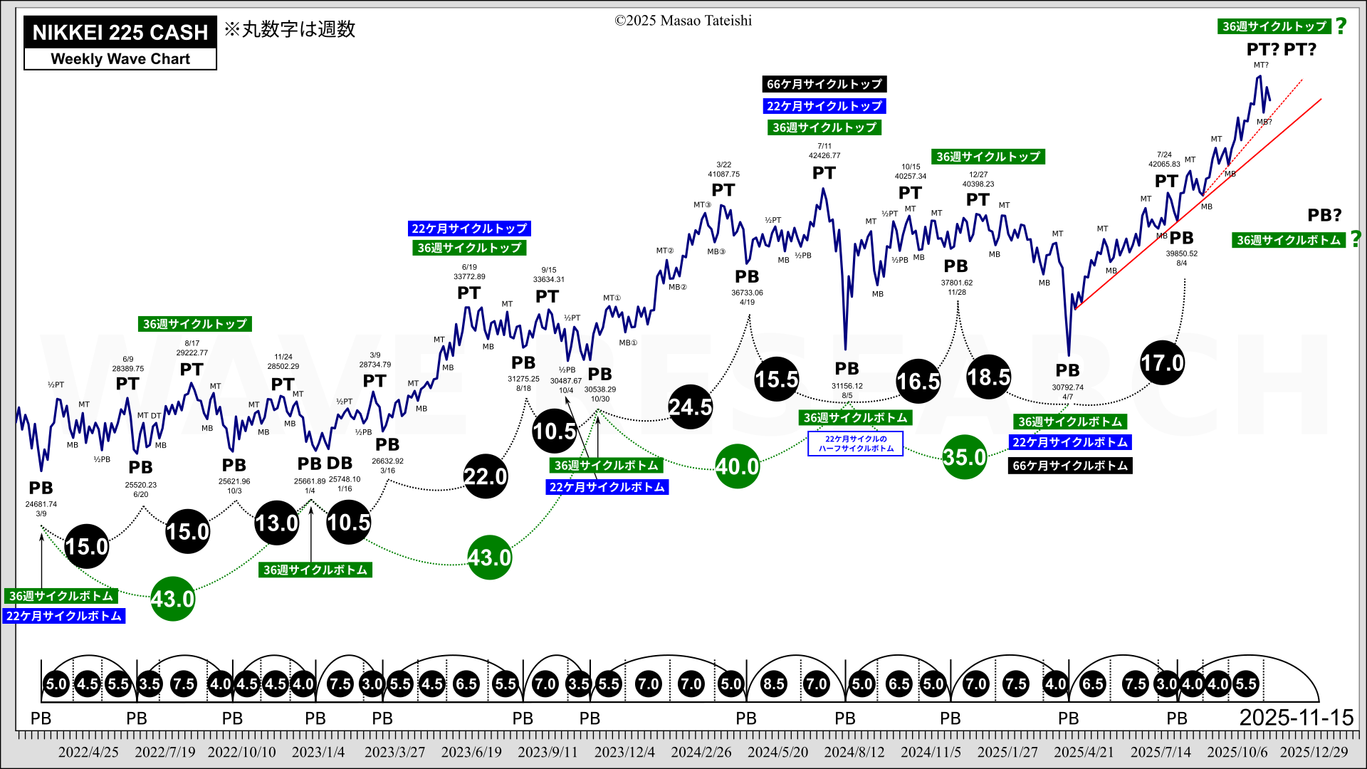 - PC(プライマリーサイクル)ボトムの8月4日安値・39850から15.0~15.5週が経過