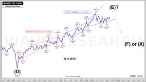 現行PCの長さが平均的なものであれば、PCボトムは20週目の12月第4週までに発生する見込みです。しかしボトムは既にPC15.0週目であった11月9日の48235でつけたという見方も有効です。いっぽうで上位サイクルの影響次第では20週を超え、年をまたいで延長する余地も残っている可能性も否定できません。