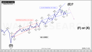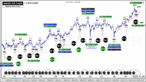 6月9日高値以降、下降チャネル(破線青)に沿った下落が続いていたが、本日チャネルのアッパー(上部)ラインをブレイクしたことで短期的には流れが変わった可能性が出てきた。少なくとも下降チャネル自体は役目を終了したと見ることができる。