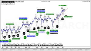 日足チャートから推定される大きなパターンは拡大トライアングル「(a)-(b)-(c)-(d)-(e)」。現在はその最後の波・(e)波が進行している可能性が高いと想定されます。